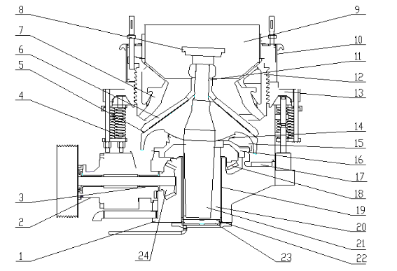 The motor drives the eccentric sleeve to rotate via a triangular belt, large pulley, transmission shaft, bevel gears, and large cone gear. The eccentric shaft nested in the sleeve undergoes a gyratory motion, mainly revolving.